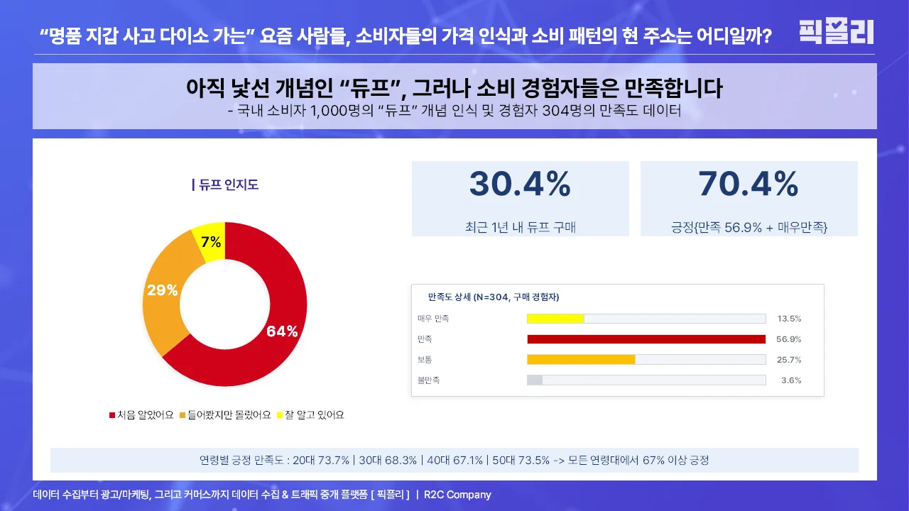 듀프 소비 경험 30.4% & 만족도 70.4%, 인지도에 비해 높은 경험률과 만족도