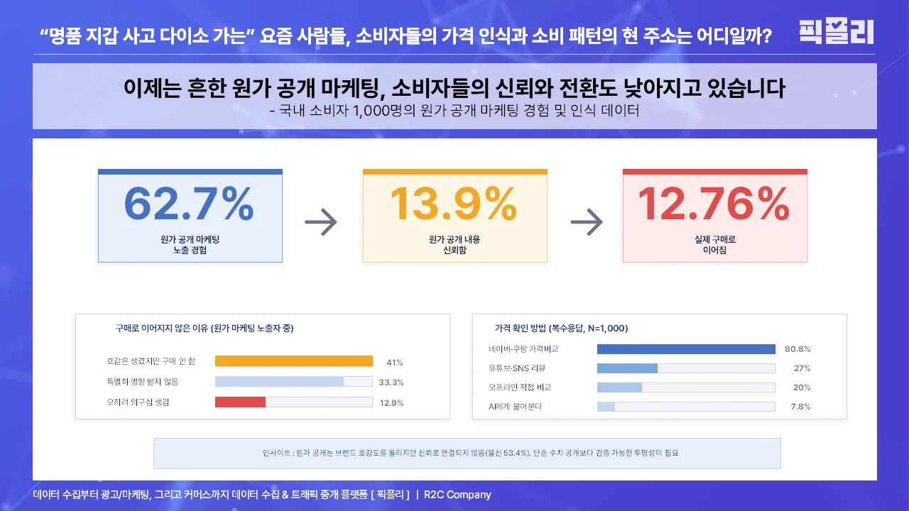 - 원가 투명성 마케팅 [ 노출 62.7% → 신뢰 13.9% → 실구매 전환 12.76% ] — 노출 대비 전환이 낮고, 불신이 53.4%로 과반 차지