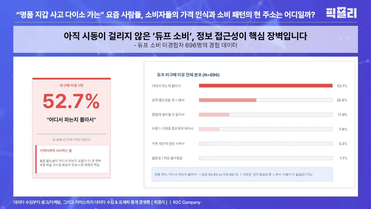 1위가 품질 불신(11.9%)이 아닌 정보 접근성(52.7%)이라는 점을 눈여겨 봐야 할텐데요. 듀프 소비를 막는 가장 큰 장벽은 제품의 신뢰도가 아니라, '어디서 살 수 있는지 모른다'는 유통 정보의 부재입니다. 달리 말하면, 정보를 제공하는 것만으로도 구매로 이어질 가능성이 높다는 것이죠.