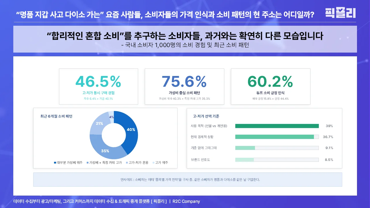 소비자는 가격을 어떤 기준으로 '납득'하는지, 듀프 제품을 알면서도 왜 사거나 사지 않는지, 원가를 공개하는 브랜드를 실제로 신뢰하는지, 고가와 저가를 어떤 논리로 오가는지 — 이런 '소비자의 속마음'은 기존 데이터에서 찾기 어렵습니다.