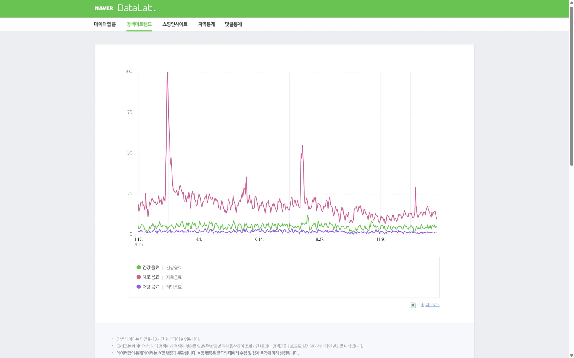 네이버 데이터랩, 구글 트렌드를 꾸준히 모니터링하면 시장 변화를 선제적으로 파악할 수 있습니다. 검색량 추이와 인구통계 데이터를 교차 분석하면 더 정교한 가설을 세울 수 있고, 이 가설들을 바탕으로 다음 단계에서 차별화된 데이터를 수집할 수 있습니다. 뿐만 아니라 이 과정을 통해서 검색량이 많은 키워드 혹은 반대로 아직 검색량이 적은 키워드를 찾아내 이를 광고 소재 제작에 활용하거나 콘텐츠 마케팅에 적용할 수도 있답니다.