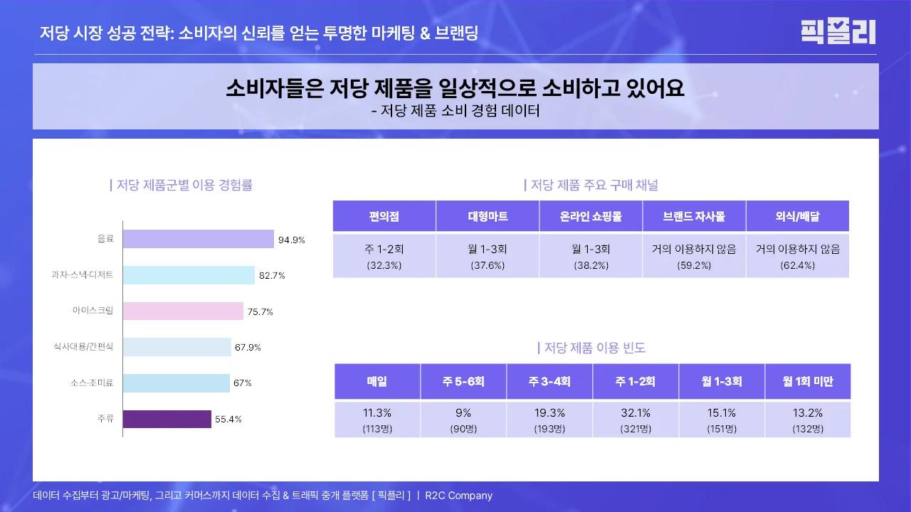 픽플리 팀 또한 지난 3월, “제로(Zero) 마케팅, 늦기 전에 소비자 신뢰에 신경 써야 할 때”를 통해 제로 음료에 대한 소비 경험과 생각에 대한 데이터를 조사하여 다룬 바가 있는데요. 건강 관리, 다이어트, 당뇨 예방 등의 ‘웰빙 트렌드’가 확산되면서 제로와 저당 제품에 대한 사람들의 관심이 높아지고 있는 만큼 저당 식품 및 제품에 대한 소비자들의 경험과 인식을 파악해야겠다는 생각을 하게 되었습니다.. 이에 픽플리 팀은 8월 29일 오후 1시부터 같은날 오후 7시까지 1,000명의 소비자를 대상으로 이번에는 <🍯저당 식품, 어떻게 소비하고 계신가요?> 라는 제목의 프로젝트로 데이터를 수집했는데요. 지난 콘텐츠의 ‘제로 음료’에서 이번에는 저당 식품으로 확장하여 ‘저당’과 ‘제로’를 조작적으로 정의하고, 저당 제품에 대한 소비 경험, 선택 이유와 소비 패턴, 소비자의 인식 및 개선 요구 데이터를 수집하여, 저당 식품에 대한 소비자의 신뢰를 확인하며, 저당 제품 시장과 마케팅 전략 인사이트를 알아보았습니다.